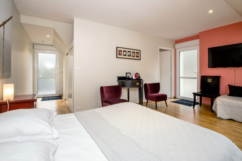 Chambre CaméliaChambre Caméliaà Partir de115 €Une chambre homologuée pour 3 personnes.(1 lit double 160×200 et 1 lit simple 80×200). Accès direct. Terrasse au Sud. Salle de bain avec baignoire. Réserver